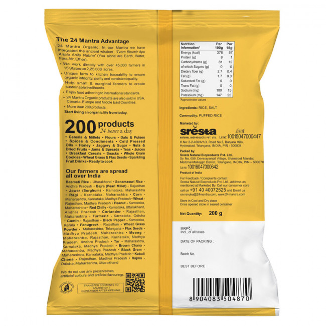 Puffed rice or expanded rice is a versatile product made from rice grains. Puffing is a process in which sudden release of water vapour causes the expansion of pre-gelatinized grains. Puffed rice being a pre-cooked ready-to-eat product can be used as a snack and can be made part of snack foods. Rice like any other cereal provides a fair amount of protein, phosphorous, iron and in small amounts B vitamins. Our 24 Mantra Organic Puffed Rice is a good source of energy and a versatile ingredient. Puffing makes rice kernels increase in volume and a fully heat-treated, crisp, porous, ready-to-eat product is obtained. 24 Mantra Organic Puffed Rice is excellent in appearance and crunchiness. There is No mud, sand or external contamination in the product. It has almost negligible amount of fat. It is mildly salted so that it can be eaten as such. Goodness of 24 Mantra Organic Food: Organic food is grown on the right soil, without the use of harmful or synthetic pesticides, fertilizers or other chemicals. Organic food production on the basis of several studies is Known to have potential human health benefIt's. Agricultural practices based on the use of chemical pesticides have been linked to negative impacts on human health and environment. 24 Mantra Organic Puffed Rice is a safe cereal for celiac patients because it is gluten Free. It is light and versatile product. Bhelpuri, chivda, puffed rice-jaggery laddus etc can be made with puffed rice or it can be eaten as such.