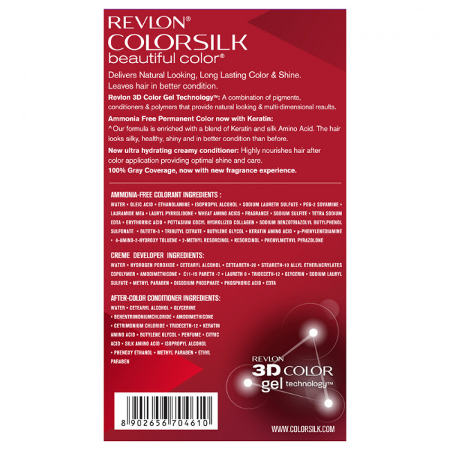 Transform your hair with Revlon's ammonia free hair colour. Formulated with 3D color gel technology and a combination of specially blended dyes, conditioners and polymers it delivers a natural looking, multi-tonal color from root to tip that not only boosts your hair colour but also adds a tad bit of definition and dimensionality to it. Revlon's Colorsilk Hair Colour features an ammonia free formula infused with silk proteins and pro vitamins that penetrates through each strand to give you silky, shiny and healthy looking hair. Enriched with UV defense, it helps keep colour vibrant, dimensional and true.